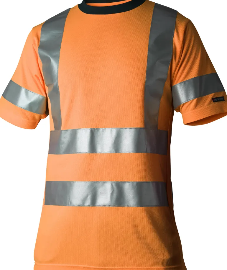 Oranssi T-paita, jonka huomioluokka on 2. Valmistettu teknisestä materiaalista, joka siirtää hien pois iholta ja haihduttaa sen nopeasti vaatteesta.