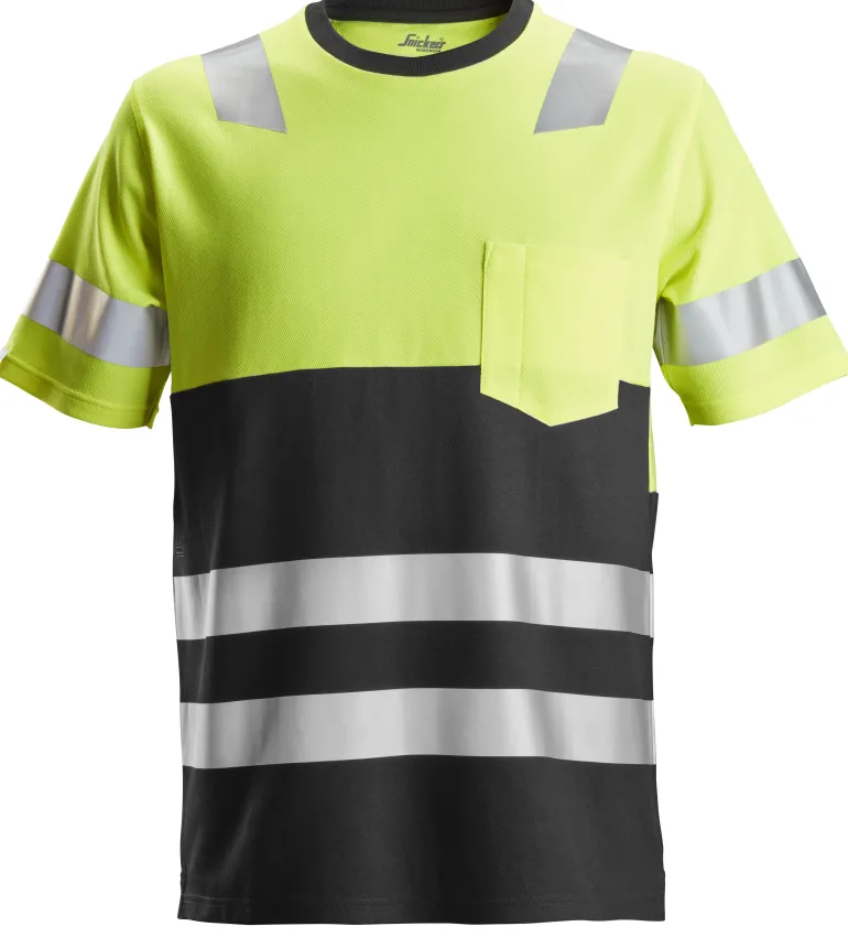 Snickers 2534 AllroundWork on lyhythihainen puuvillainen huomio-t-paita, jonka mukava puuvillapinta sisäpuolella takaa optimaalisen käyttömukavuuden. Joustavat painetut heijastinnauhat ulkopuolella, luokan 1 näkyvyys.