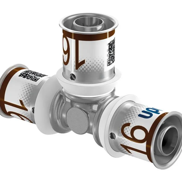 T-putki, valmistettu sinkkikadon kestävästä messingistä, putken ulkohalkaisija 16 x 16 x 16 mm ja puristusmuhvit. Ruostumattomasta teräksestä valmistetulla puristusholkilla, puristusohjaimella ja koon värikoodilla.