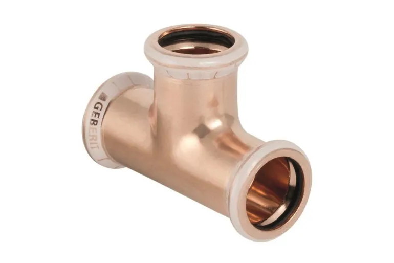 Geberit 1768296 on T-putki, joka puristetaan M-leuoilla. Mallissa on puristusmuhvi x puristusmuhvi x puristusmuhvi.