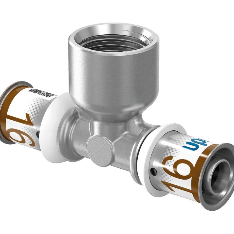 Uponor Press Plus 1808034 on T-putki, jossa on ruostumattomasta teräksestä valmistettu puristusholkki. Liittimessä on puristusohjain, puristuksen ja koon värikoodi.
