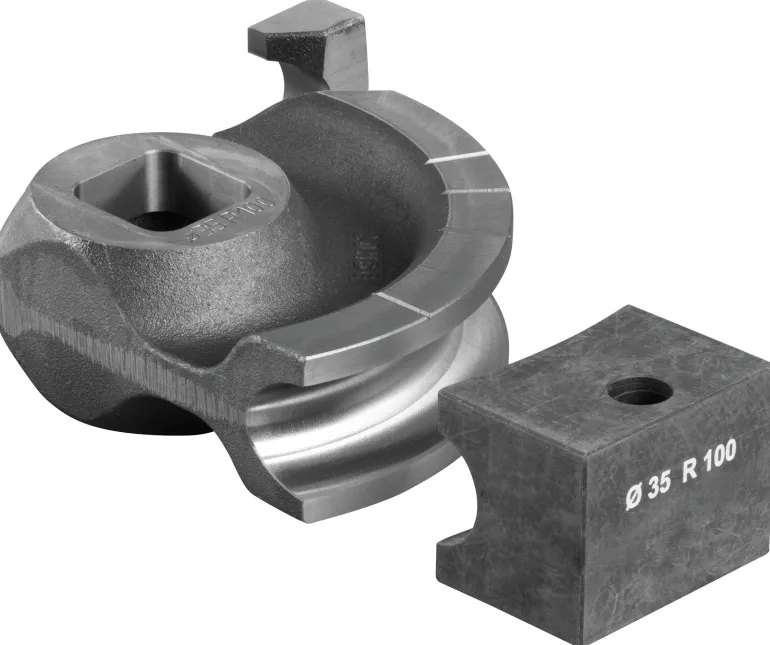 Taivutussegmentti ja liukukappale valurautaa, 90°, malliin REMS Curvo 50. Taivutussegmenttien ja liukukappaleiden optimaalinen sovitus takaa materiaalin mukaisen liukumisen ilman halkeilua tai taittumista. Kulma-asteikko jokaisessa taivutussegmentissä ja merkintä jokaisessa liukukappaleessa mittatarkkaa taivutusta varten. Taivutussegmentin ja liukukappaleen nopea vaihto.