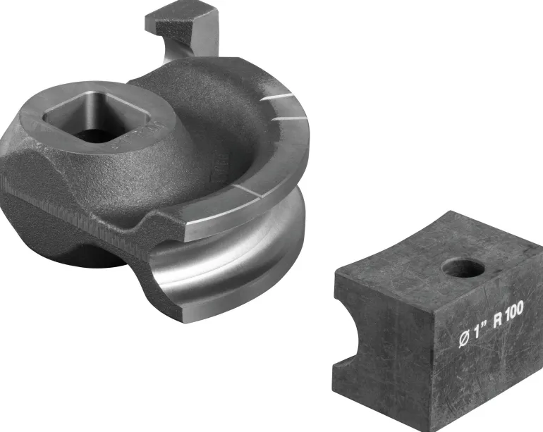 Taivutussegmentti ja liukukappale valurautaa, 90°, malliin REMS Curvo 50. Taivutussegmenttien ja liukukappaleiden optimaalinen sovitus takaa materiaalin mukaisen liukumisen ilman halkeilua tai taittumista. Kulma-asteikko jokaisessa taivutussegmentissä ja merkintä jokaisessa liukukappaleessa mittatarkkaa taivutusta varten. Taivutussegmentin ja liukukappaleen nopea vaihto.