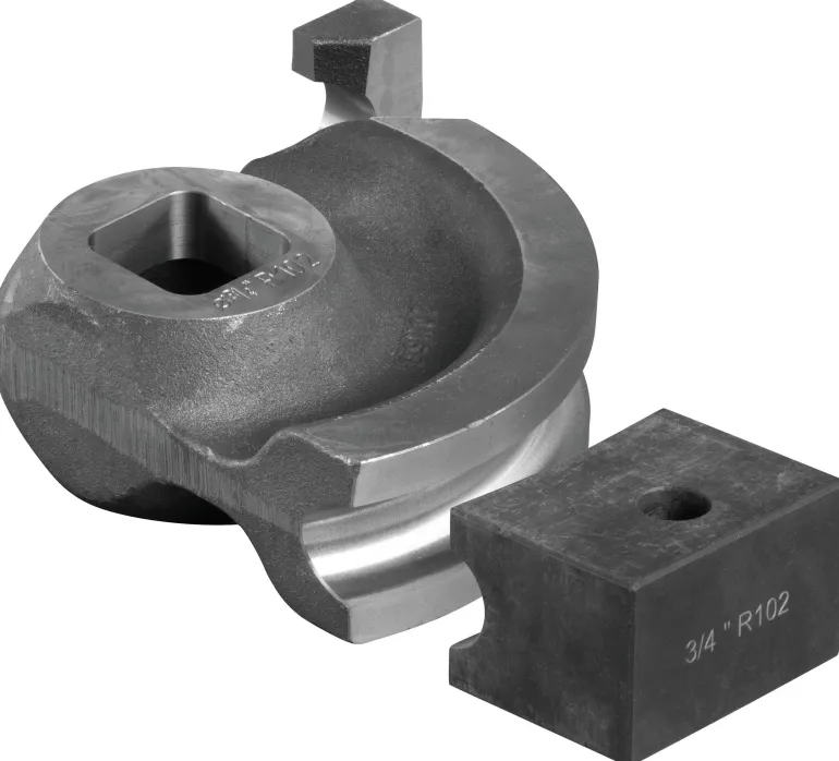 Taivutussegmentti ja liukukappale valurautaa, 90°, malliin REMS Curvo 50. Taivutussegmenttien ja liukukappaleiden optimaalinen sovitus takaa materiaalin mukaisen liukumisen ilman halkeilua tai taittumista. Kulma-asteikko jokaisessa taivutussegmentissä ja merkintä jokaisessa liukukappaleessa mittatarkkaa taivutusta varten. Taivutussegmentin ja liukukappaleen nopea vaihto.