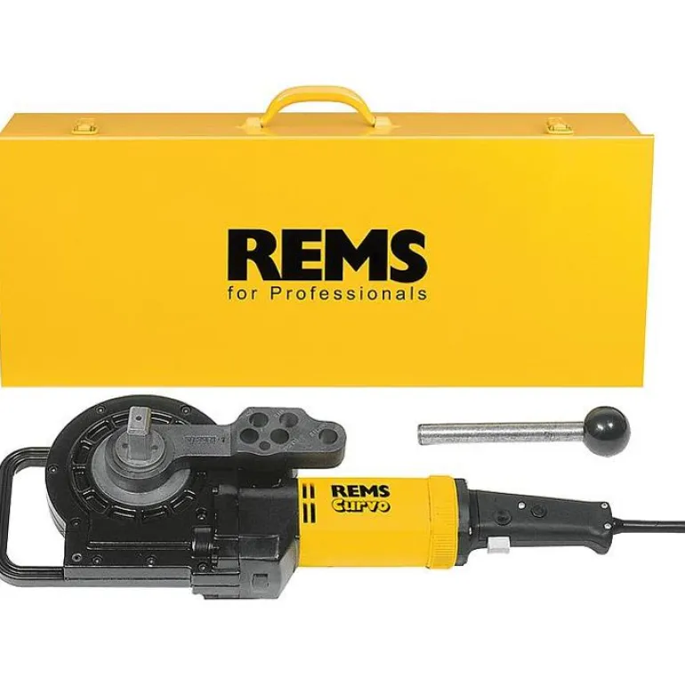 REMS-taivutuskone ja Curvo Set 12, 15, 18, 22, 28 mm. Koneessa huoltovapaa käyttömekanismi, turvakytkin, yleismoottori 230 V, 50 – 60 Hz, 1000 W, portaaton, elektroninen turvakytkin, jossa pikapysäytys, suunnanvaihto.