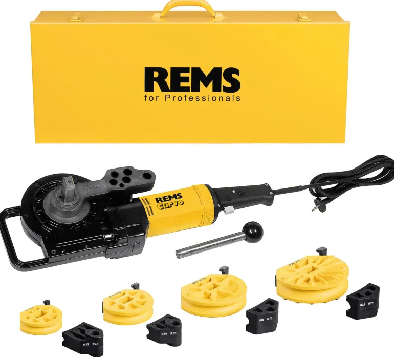 REMS Curvo -putkentaivutuskone, mukana sarja 12, 15, 18, 22 mm. Koneessa huoltovapaa käyttömekanismi, turvakytkin, yleismoottori 230 V, 50 – 60 Hz, 1000 W, portaaton, elektroninen turvakytkin, jossa pikapysäytys, suunnanvaihto.