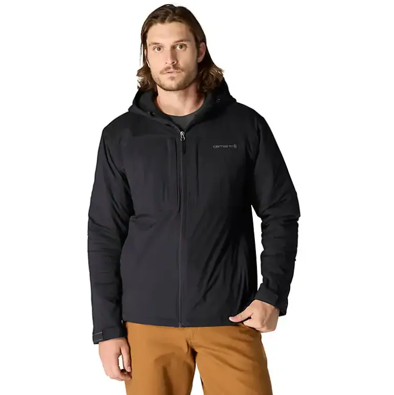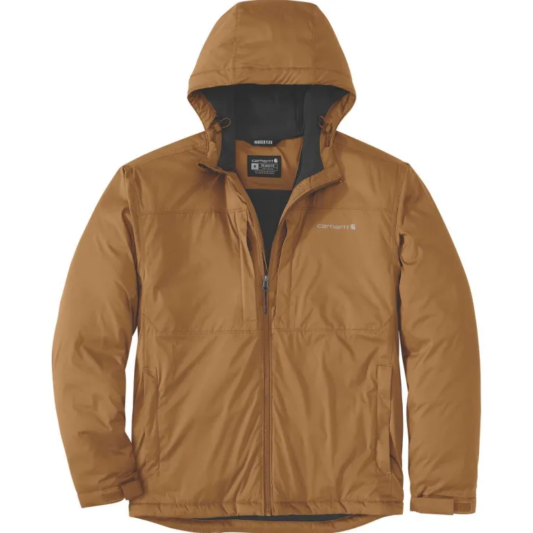 Rugged Flex™ lisää liikkuvuutta. Kosteutta siirtävät Carhartt Force™/FastDry™ -teknologiat yhdistettynä antimikrobisiin ominaisuuksiin – erinomaiset ominaisuudet pidempiaikaisessa yhtäjaksoisessa käytössä. Kiinteä kolmiosainen huppu, jossa on säädettävä alareuna ja piilotettu kiristysnyöri. Lisäksi korkeampi kaulus ja pidennetty, säädettävä helma lisäävät suojausta. Käytännölliset yksityiskohdat, kuten mahdollisuus pakata takki kätevästi omaan taskuunsa, vetoketjulliset rinta- ja etutaskut sekä vetoketjullinen sisätasku auttavat pitämään kaikki järjestyksessä. Sääsuojauksen, hyvän liikkuvuuden (Rugged Flex™) ja eristeen ansiosta tämä takki sopii niin työ- kuin aktiiviseen vapaa-ajankäyttöön. Takki on valmistettu 100 % nailonista (DWR Nylon). Normaali konepesu 40 °C.