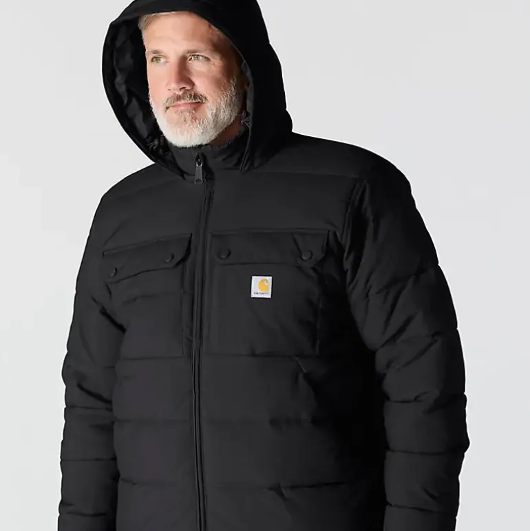 Carharttin takki, joka sopii sekä arki- että työkäyttöön. Takki on erittäin kulutusta kestävä, lämmin ja mukava päällä. DWR-käsitelty nailonkuori hylkii kevyttä sadetta ja likaa, ja Rain Defender™- sekä Wind Fighter™ -teknologiat pitävät sinut kuivana ja suojaavat tuulelta. Sisäpuolella kevyt sherpa-vuori tuntuu pehmeältä ja lämpimältä, ja Syncloud Loft -eristys auttaa säilyttämään lämmön myös lämpötilan laskiessa. Loose fit -istuvuus (isohko). Kiinteä, kolmiosainen huppu piilotetulla kiristysnyörillä sekä korkea kaulus tarjoavat lisäsuojaa sään muuttuessa. Vetoketjulliset sivutaskut ja ulkopuoliset rintataskut napeilla (vasemmassa piilovetoketju). Pidennetty takahelma säädettävällä kiristysnyörillä suojaa selkää liikkeessä, ja joustavat hihansuut pitävät kylmän loitolla. Kankaan paino on 153 g/m², mikä tekee takista keskipainoisen – se yhdistää hyvän liikkuvuuden ja kestävyyden, ollen riittävän jämäkkä päivittäiseen käyttöön mutta silti kevyt ja mukava koko päivän pidettäväksi. Tämä takki on sinulle, joka tarvitset lämpöä, sääsuojaa ja kestävyyttä. Täydellinen sekä työhön että vapaa-aikaan. Kangas 100 % nailonista.