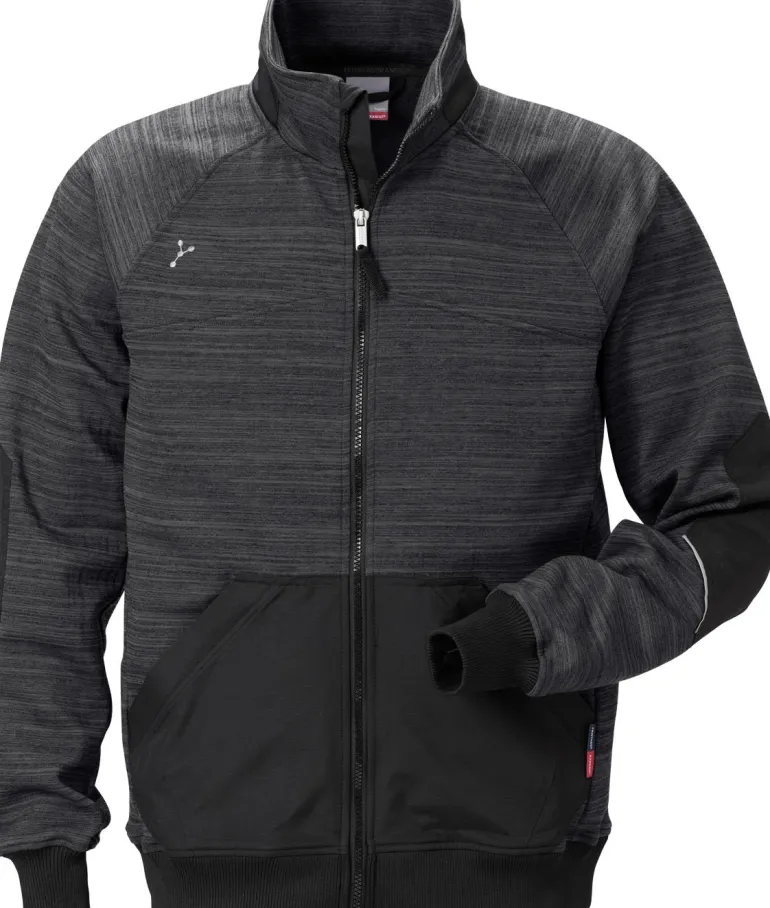 Hupullinen collegetakki vahvikkeilla. Mukava kestävästä materiaalista valmistettu työtakki tai pusero, jossa on heijastavat yksityiskohdat ja vetoketjulliset taskut.