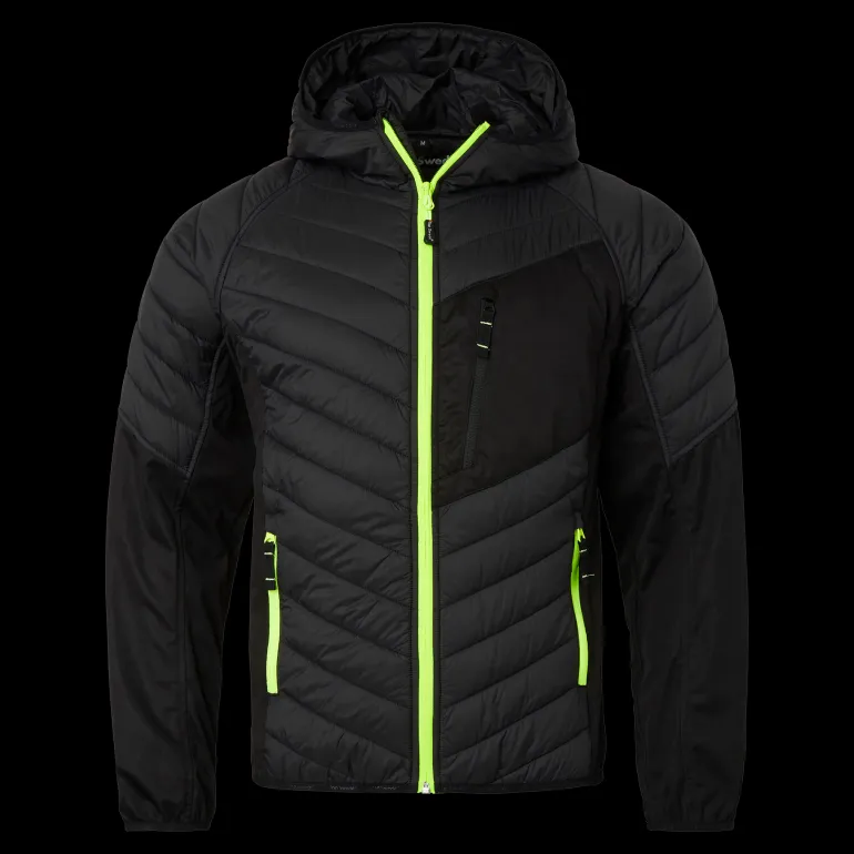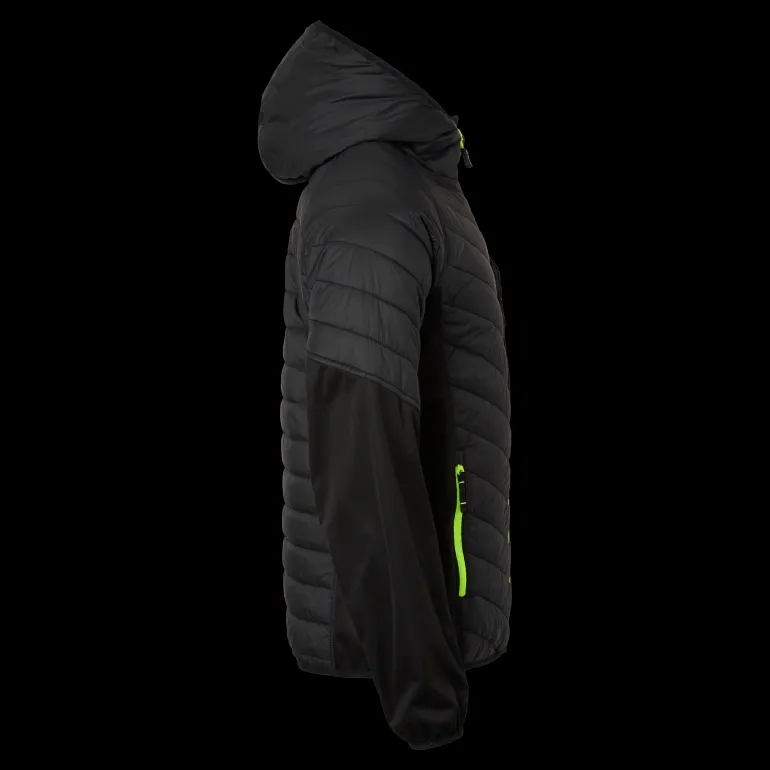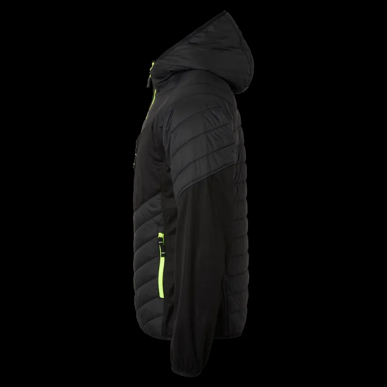 Moderni tikattu kevyttoppatakki, jossa on huppu. Tuntuu kuin untuvalta, softshell-paneelitsivuilla kylkien ja kainaloiden kohdalla. Kaksi etutaskua ja yksi vetoketjullinen rintatasku. Joustavat resorit hihansuissa ja helmassa. Päämateriaali: 100 % Nailonia.