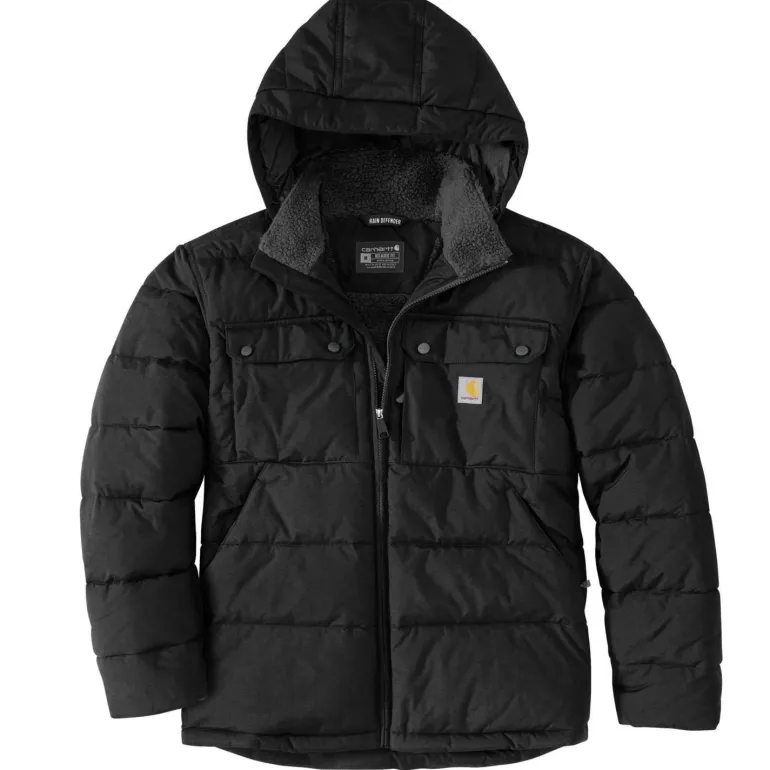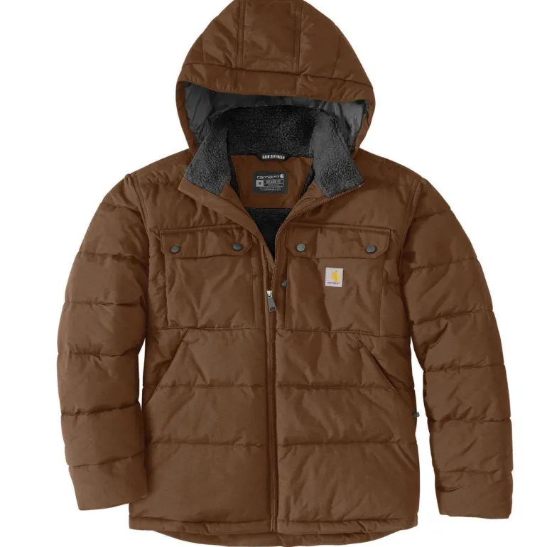 Carharttin takki, joka sopii sekä arki- että työkäyttöön. Takki on erittäin kulutusta kestävä, lämmin ja mukava päällä. DWR-käsitelty nailonkuori hylkii kevyttä sadetta ja likaa, ja Rain Defender™- sekä Wind Fighter™ -teknologiat pitävät sinut kuivana ja suojaavat tuulelta. Sisäpuolella kevyt sherpa-vuori tuntuu pehmeältä ja lämpimältä, ja Syncloud Loft -eristys auttaa säilyttämään lämmön myös lämpötilan laskiessa. Loose fit -istuvuus (isohko).