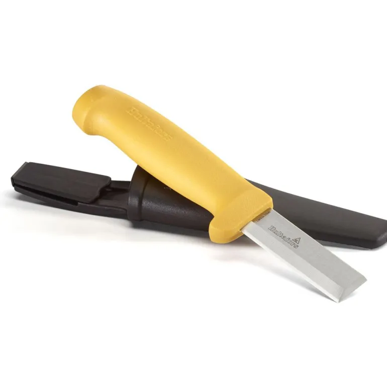 Tehokas V-teroitettu puukko talttatoiminnolla. Ainutlaatuisen kiinnitysmekanismin ansiosta tuppi ei irtoa vahingossa työvaatteen napista, vaikka se on tarvittaessa helppo irrottaa.