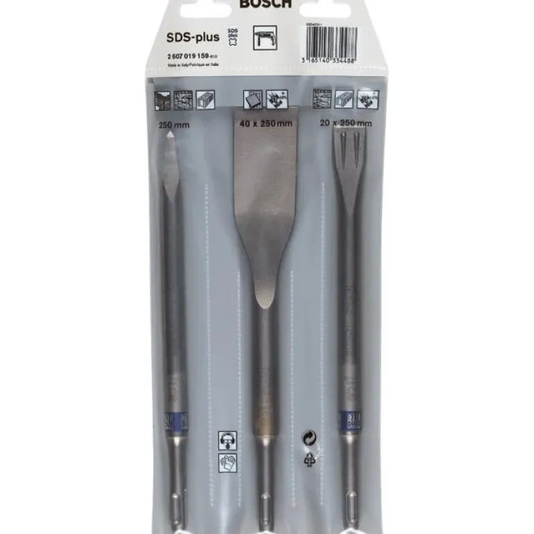 Meisselisarja SDS-Plus-kiinnityksellä, sisältää kärkitaltan, talttaterän ja kaakelitaltan. Piikkausvasaraan, poravasaraan ja iskuvasaraan, joissa on SDS-Plus-kiinnitys.