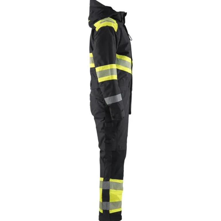 100 % polyesteri, oxford, laminoitu, tuulenpitävä, vedenpitävä 15000 mm, hengittävä Ret 8,5, 200 g/m². Tuulen- ja vedenpitävä, hengittävä materiaali. 15000 mm/4 000 g/m²/24 h. Fluoresoivat värit ovat EN ISO 20471 -standardin mukaisia (Näkyvä varoitusvaatetus ammattikäyttöön). Materiaali on EN 343 -standardin luokan 3/3 -mukainen (Suojaus sateelta).