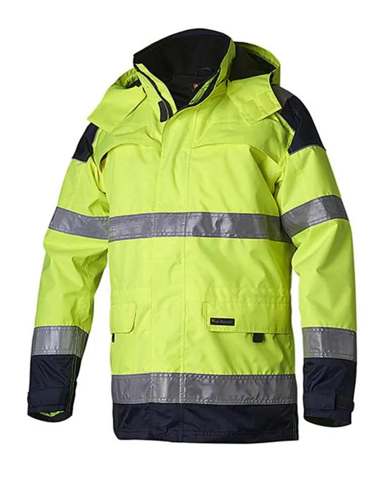 Tuulen- ja vedenpitävä talviparka huomiovärillä, keltainen/laivastonsininen, hyvin hengittävä. Takissa on fleecevuori, jota voi käyttää erikseen. Ulkotakkia voidaan käyttää kuoritakkina ilman vuoria. Monta käytännöllistä taskua. 100 % polyesteriä.