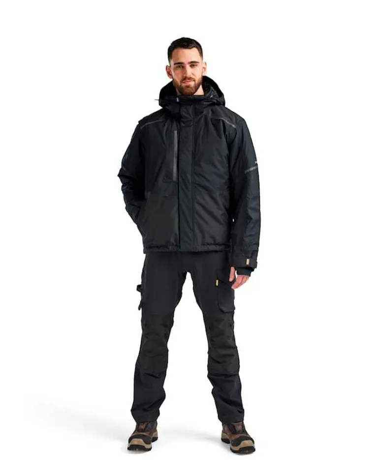 100 % polyesteri, twill, joustava, laminoitu, tuulenpitävä, vedenpitävä 11000 mm, hengittävä Ret 6,3, 150 g/m². Konepesu 40 °C, ei rumpukuivausta. Tuulen- ja vedenpitävä, hengittävä ja joustava materiaali. 11 000 mm/4000 g/m²/24 h. Fluoresoivat värit ovat EN ISO 20471 -standardin mukaisia (Näkyvä varoitusvaatetus ammattikäyttöön). Materiaali on EN 343 -standardin luokan 3/3 -mukainen (Suojaus sateelta).
