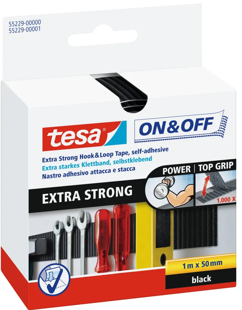 Tesa 55229 On & Off Extra Stark on monipuolinen tarranauha, joka on suunniteltu kiinnittämään painavampia esineitä seinään tai muulle tasaiselle pinnalle. Käytä tarranauharatkaisua työtilasi järjestämiseen kiinnittämällä työkalusi seinään. Vapauta työpöytäsi kaikista toimistotarvikkeista kiinnittämällä ne seinään, jotta ne ovat helposti saatavilla.