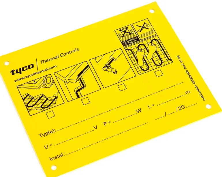 Keltainen tarvikekyltti lämmityskaapelilaitteiden merkitsemiseen. Asentaja täydentää laitetta koskevia tietoja vedenpitävällä kynällä.