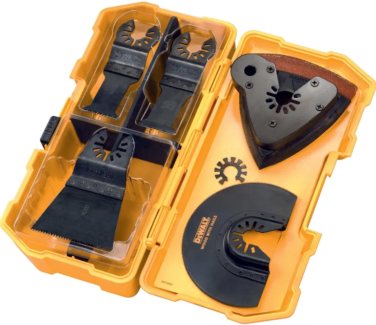 8-osainen monitoimityökalusarja säilytyslaatikossa. Sarja sisältää sahanteriä ja hiekkapapereita, voidaan puun, naulaisen puun ja muovin sahaustöissä.