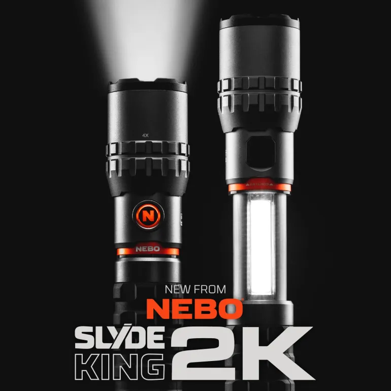 NEBO SLYDE King 2K on ladattava, vedenpitävä (IP67) ja erittäin monipuolinen taskulamppu, jossa on 4x-zoomi ja 500 luumenin C.O.B-työskentelyvalo. Kuuden tilansa ansiosta, joista tehokkain on valovirraltaan 2000 lm, se soveltuu eri käyttötarkoituksiin ja tilanteisiin.