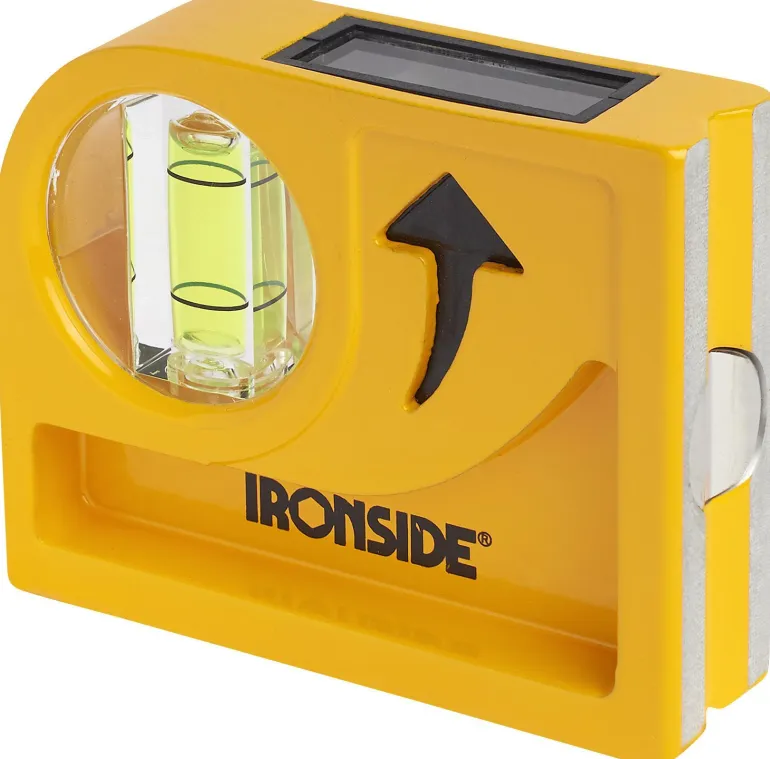 Täysvalettu. Libellillä. Libellipeili lukemisen helpottamiseen. Voimakas magneetti kahdella vastinpinnalla, molemmissa V-urat. Pituus 80 mm. Tarkkuus ±0,5 mm/m.