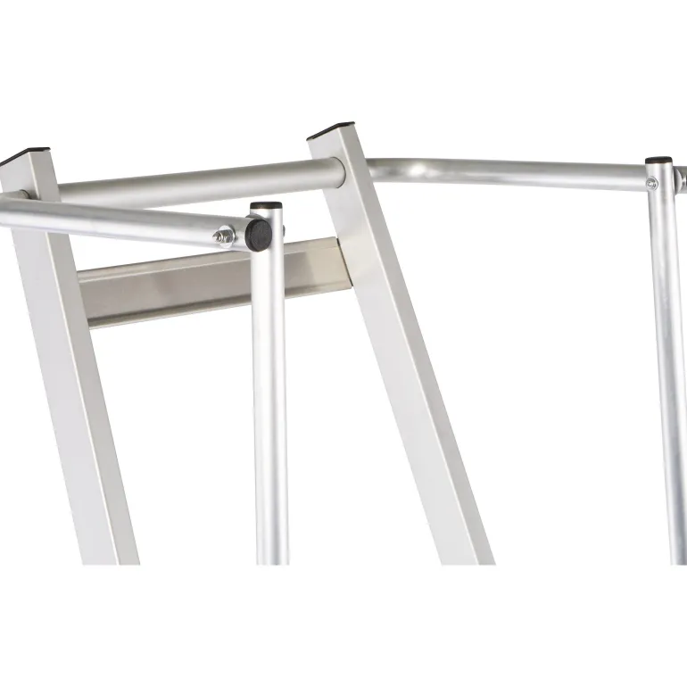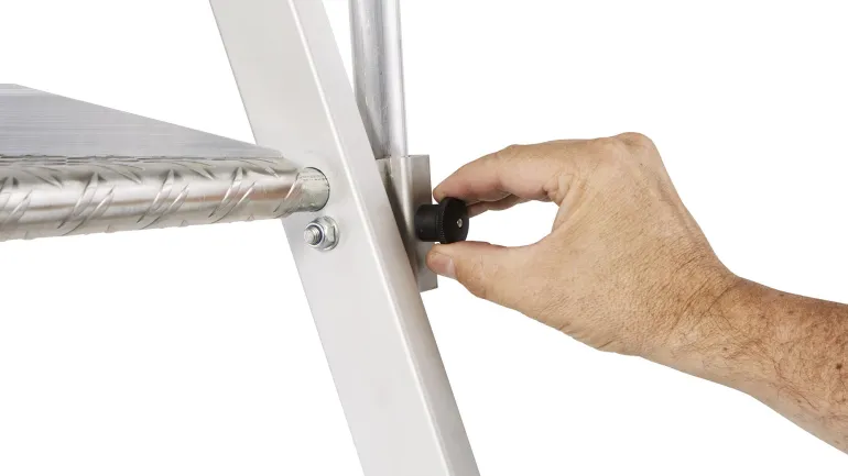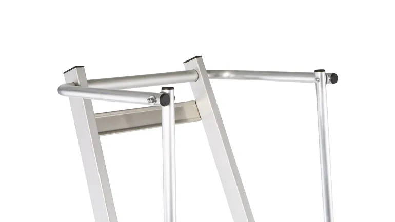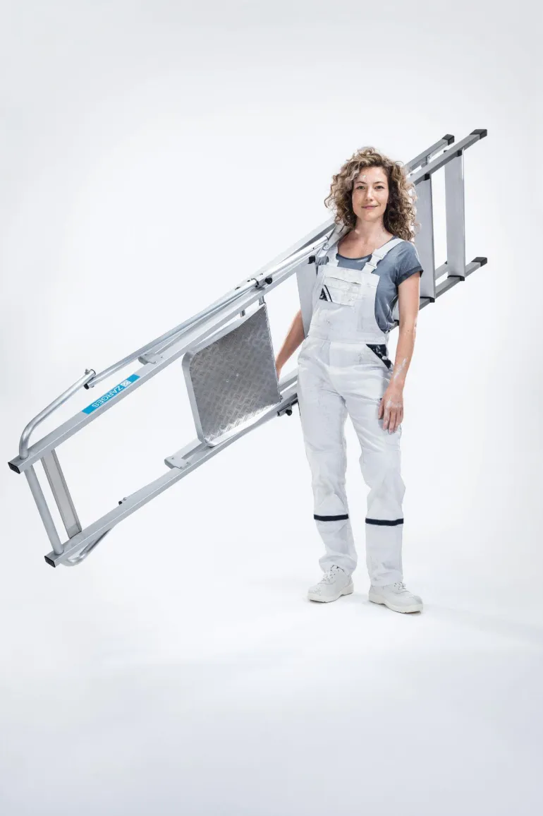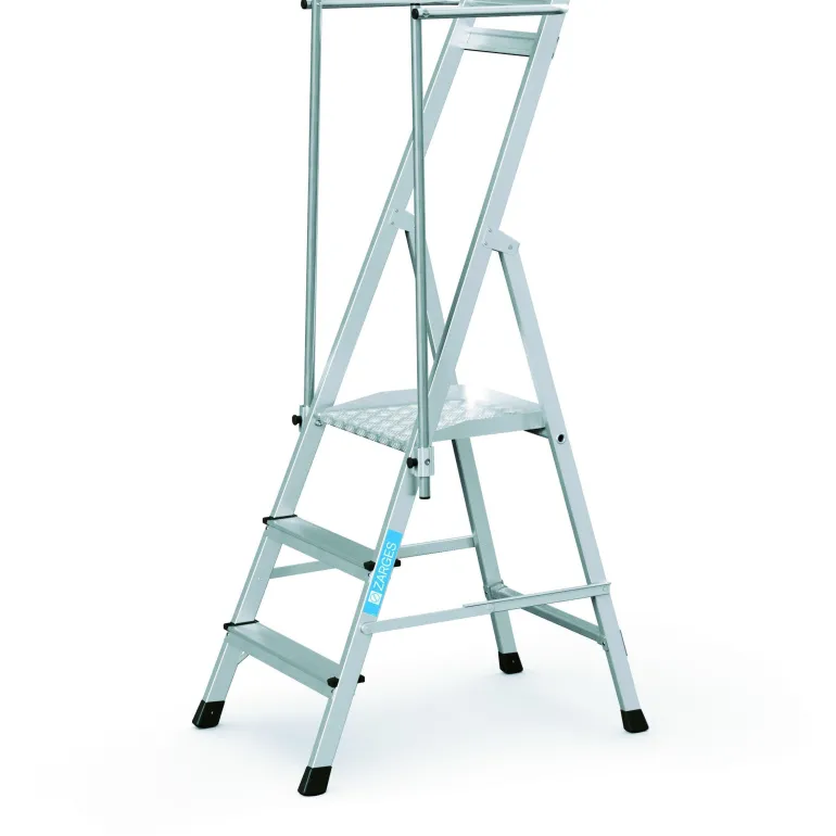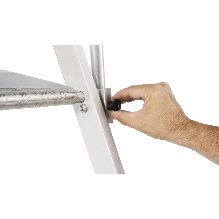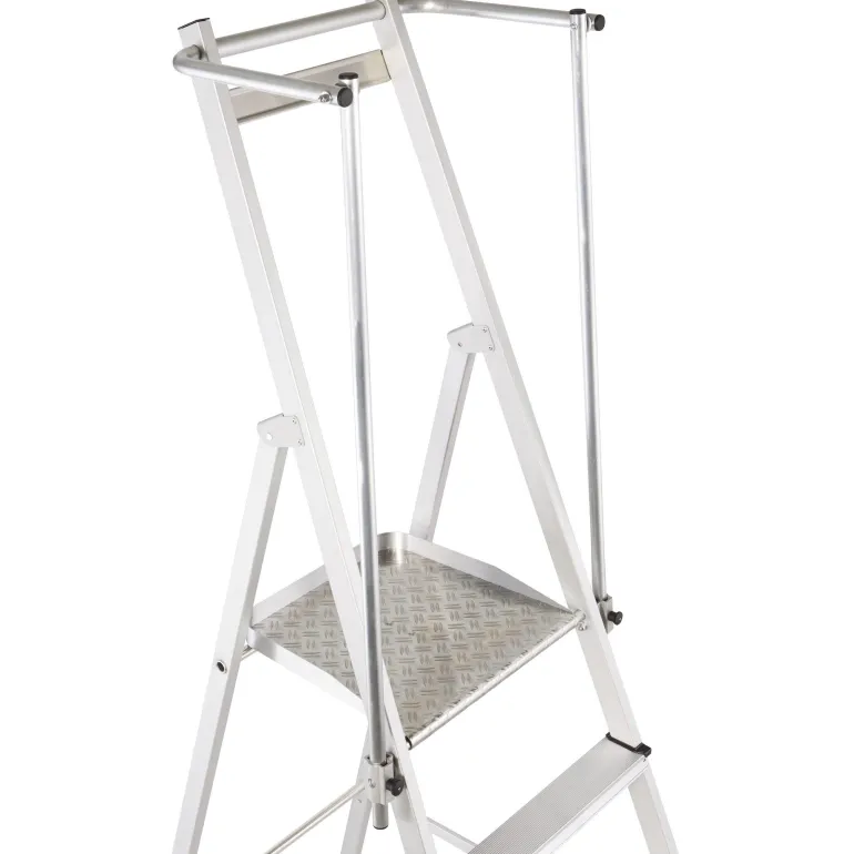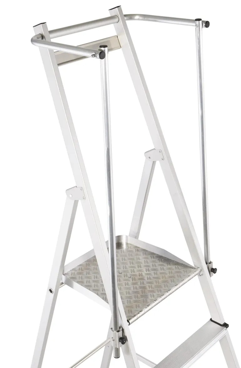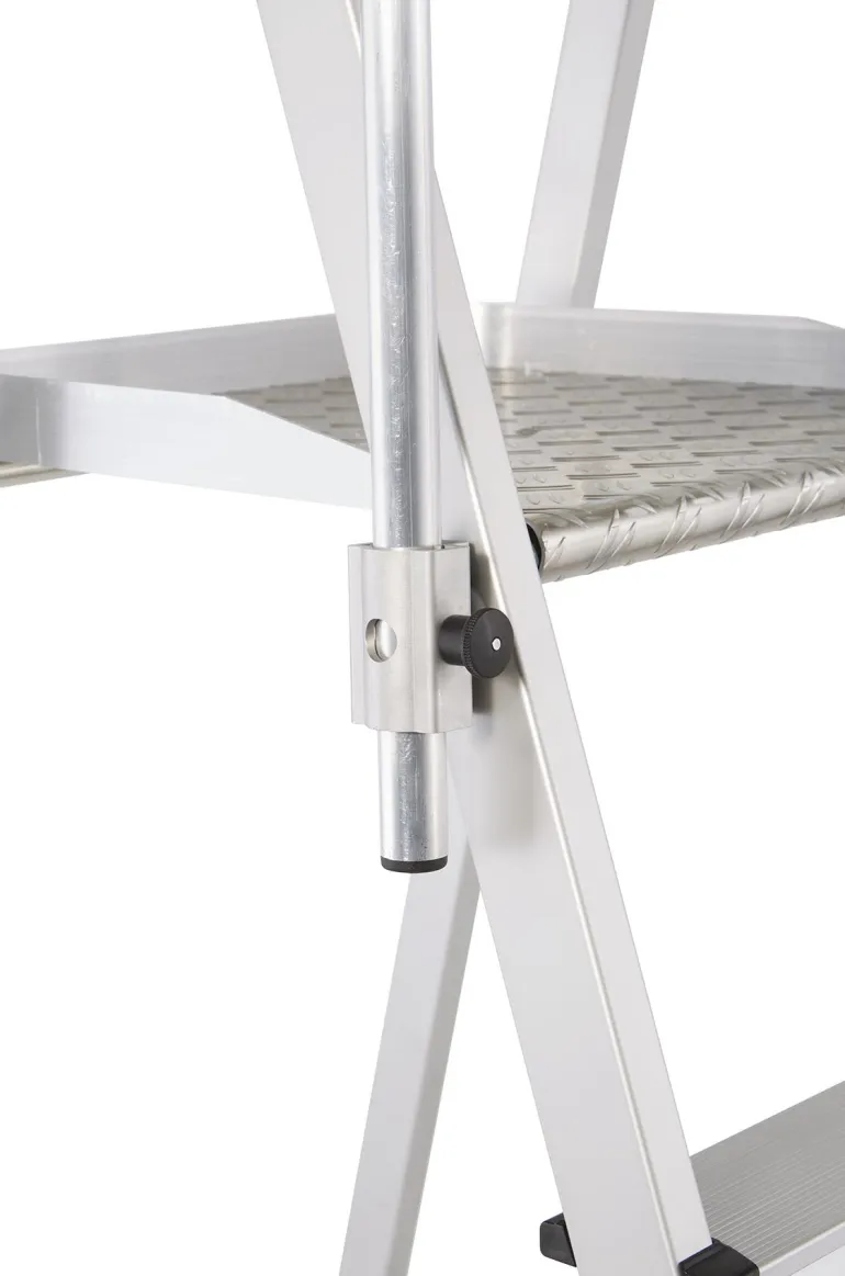 Erittäin kevyet tasotikkaat: Kevyt ja käytännöllinen kokoontaitettavien kaiteiden ansiosta. Suuri työtaso (400 x 400 mm) takaa hyvän käyttömukavuuden. Työturvallisuutta parantava kaide kolmella puolella. Kaiteen korkeus 1 000 mm. Taittuva kahva säästää tilaa kuljetuksen yhteydessä. 80 mm syvien, uritettujen portaiden ansiosta tillailla seisominen on mukavaa ja turvallista. Kolminkertaiset niitatut liitokset sivutukien ja askelmien välissä. Anodisoitua alumiinia.