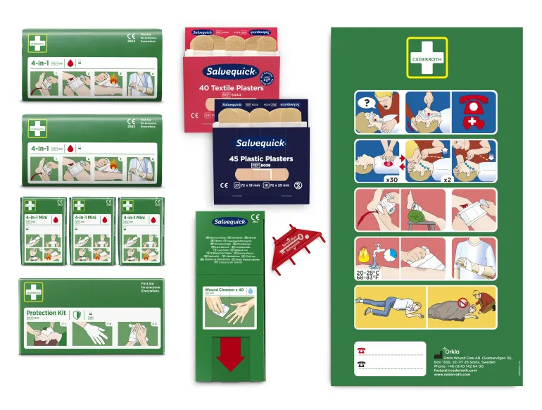 Cederroth 190900 -ensiapukaapin täydennyspakkaus. Selkeät värikuvat ja ohjeet on painettu suoraan pakkauksiin. Toimitetaan kartonkipakkauksessa.