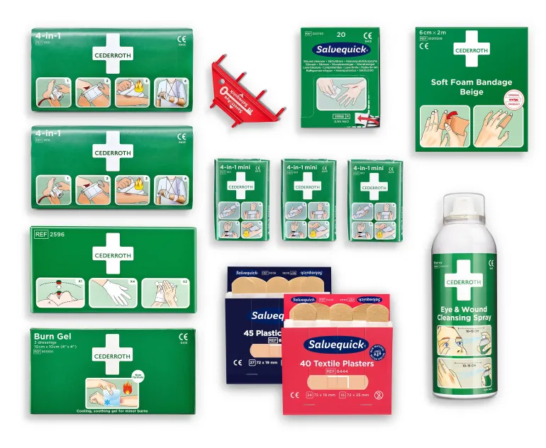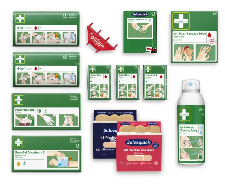 Täyttöpakkaus Cederroth Ensiapuasemaa (51011026) varten. Pakkaus sisältää kokonaisen täydennyssarjan ensiapuasemaan ja on päivitetty Soft Foam Bandage Beige-tuotteella (6 cm x 2 m).