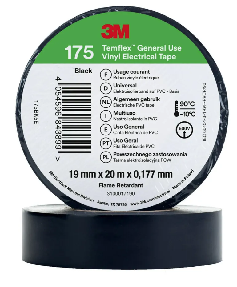 3M Temflex™ 175 on tavallista paksumpi (0,18 mm) ja kestävämpi yleiskäyttöinen sähköteippi. Yleiskäyttöinen eristävä vinyyliteippi on suunniteltu säilyttämään suorituskykynsä jopa 90 °C:n lämpötilassa. Tämä teippi on oivallinen ratkaisu edulliseen ja luotettavaan pienjännitekaapeleiden suojavaippojen tekemiseen sekä johdinsarjojen ja yksittäisten johtimien eristämiseen.