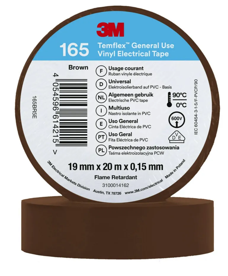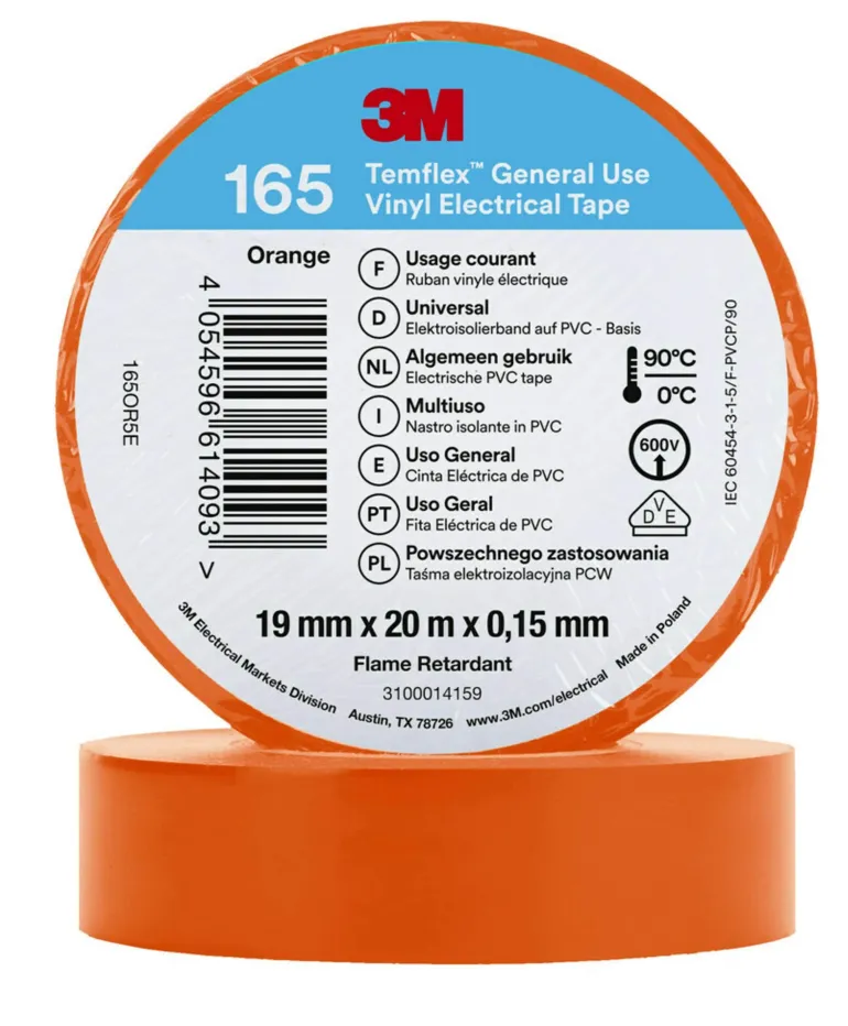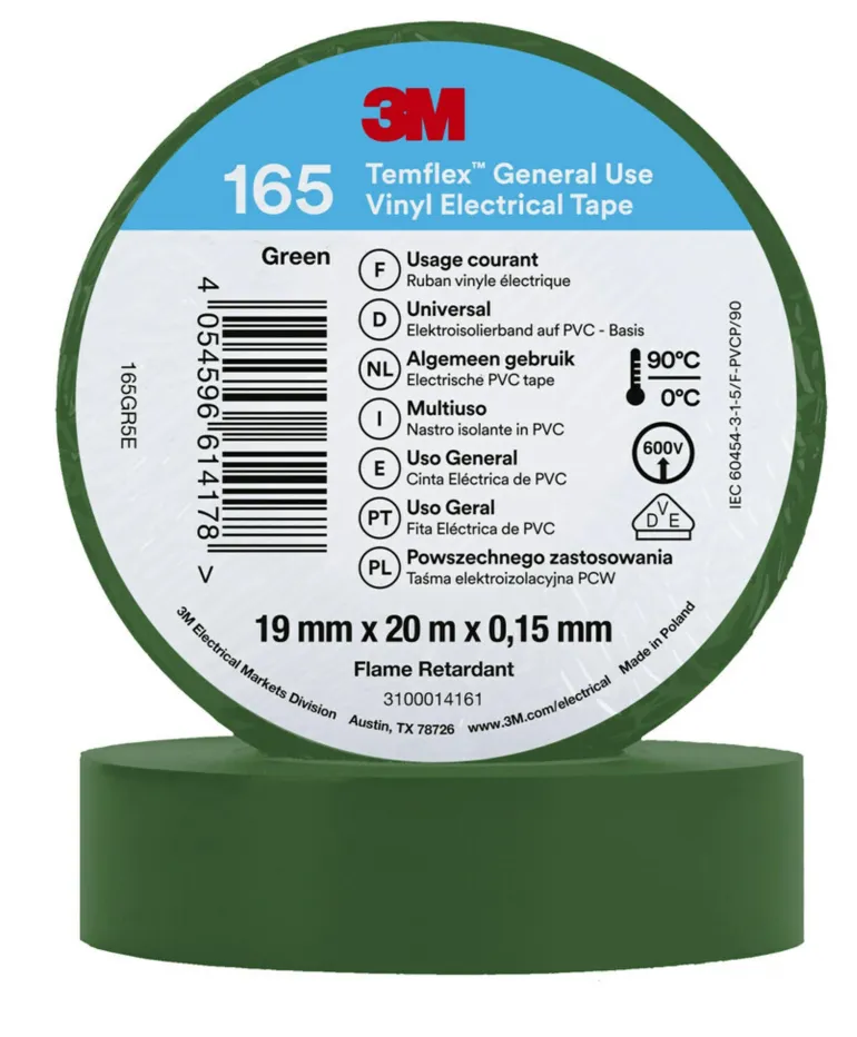 3M Temflex™ -vinyylisähköteippi 165 on 0,15 mm paksu ammattitason PVC-eristysteippi, joka soveltuu sisä- ja ulkokäyttöön. Käytä 3M Temflex™ -vinyylisähköteippiä johtojen ja kaapeleiden eristämiseen (pienjännite), korjauksiin ja johdinsarjoille.