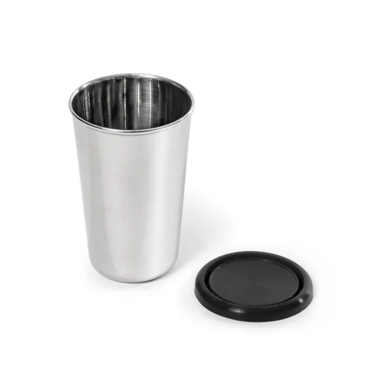 Ruostumattomasta teräksestä valmistettu muki, jossa on silikonikansi. Käytännöllinen silikonikansi pysyy tiukasti kiinni.