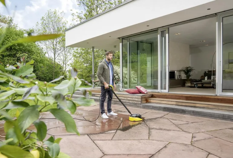 Terassipesuri halkaisijaltaan 27,5 cm, korkeuden säätö, suuttimet, jotka käynnistetään/pysäytetään jalalla. Suurempien pintojen puhdistamiseen.
