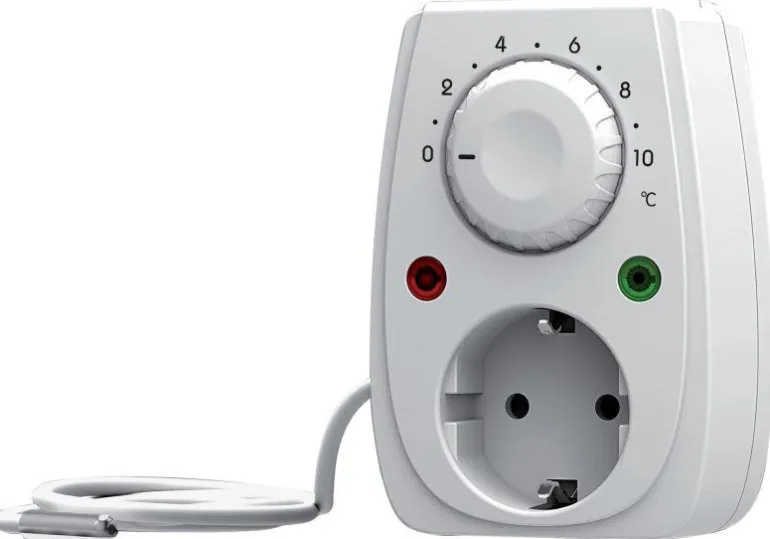 Laiteanturilla varustettu pistoketermostaatti käytettäväksi yhdessä FrostGuard-lämmityskaapelin kanssa putkien suojaamiseen pakkaselta.