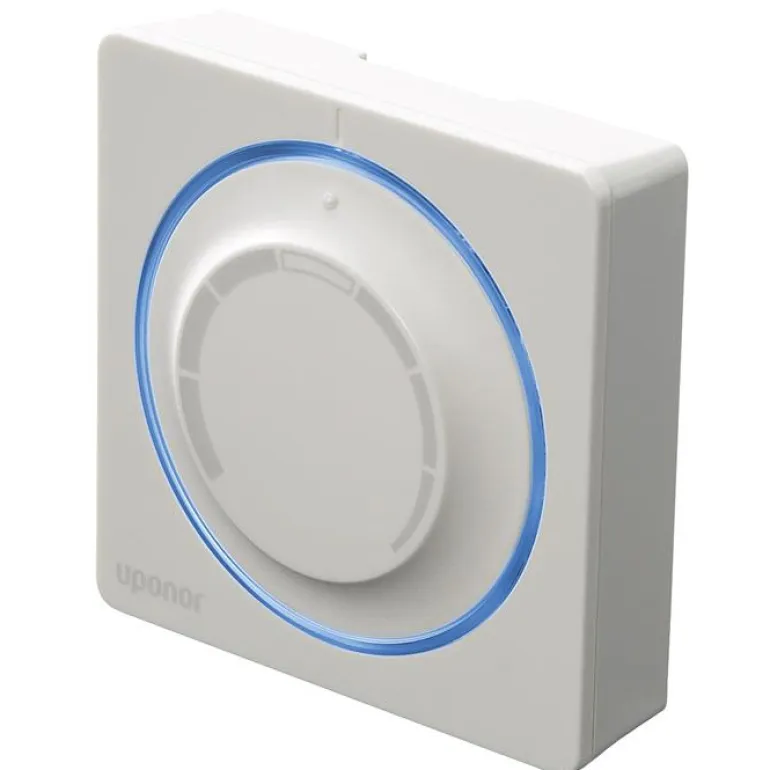 Uponor Smatrix Base T-145 on langallinen huonetermostaatti ilman näyttöä, painettu asteikko nupissa. Termostaatti kytketään nelijohtimiseen kaapeliin, ja siinä on asennusruuvit.