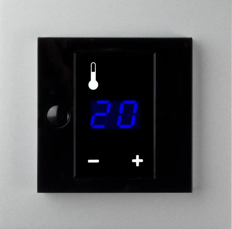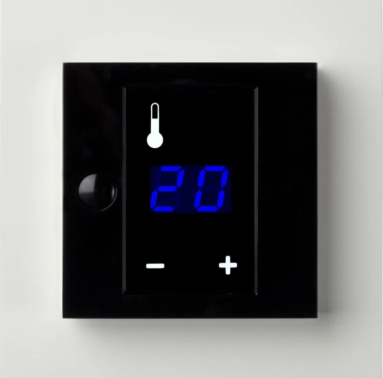 Elko Plus on musta 3600W:n termostaatti kosketusnäytöllä, jonka avulla voit valita lattia-anturin tai huonetunnistimen ohjauksen välillä. Sisäänrakennettu pakkassuoja tai rajoitus lattia-anturilla (maks. 27 astetta). Termostaatin asennussyvyys on 25 mm, sopii vakiokojerasiaan sekä kaikkiin Elko-yhdistelmäkehyksiin. Myös pinta-asennukseen korotuskehyksellä.