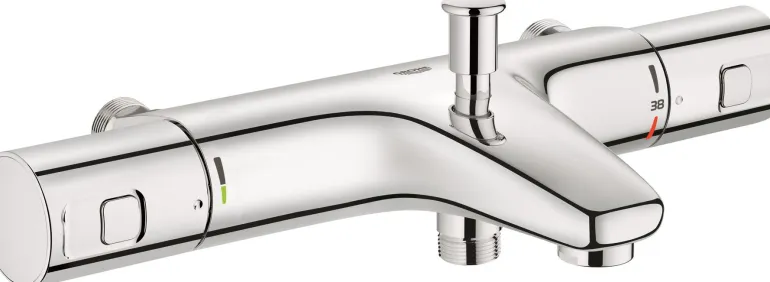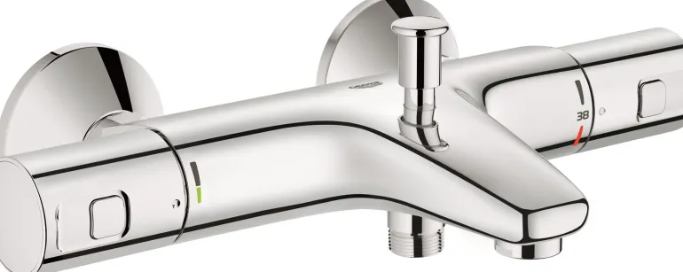 Termostaattisekoitin, jossa suihkuliitäntä sekoittimen alaosassa. Sekoittimessa on Grohen TurboStat-toiminto, jonka ansiosta haluttu veden lämpötila saavutetaan sekunnin murto-osassa ja lämpötila pysyy tasaisena koko suihkun ajan. EcoButton vähentää vedenkulutusta helposti jopa 50 %.