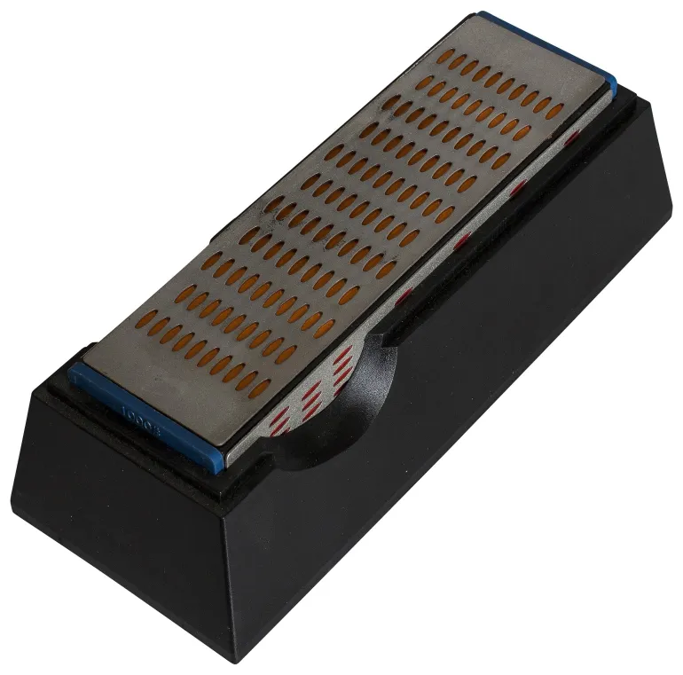 PELA 492791 on timanttihiomakivi pidikkeellä. Hiomakivi voidaan kääntää 4 eri suuntaan. Sivut hiontajyvillä: #200, #400, #600 ja #1000. Työskentele käyttäen hiontaöljyä tai vettä edeten karkeammasta raekoosta hienompaan rakeeseen. Valitse karkeus sen mukaan, kuinka kulunut tai vaurioitunut terä on. Hiomapintojen mitat: 200×55 mm.