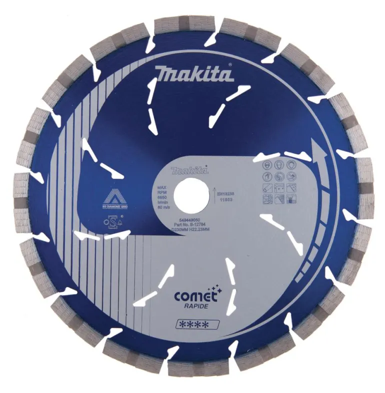 Makita Comet Rapide -timanttikatkaisulaikka, jonka halkaisija 230 mm ja segmentin korkeus 10 mm. Reiän halkaisija on 22,23 mm.