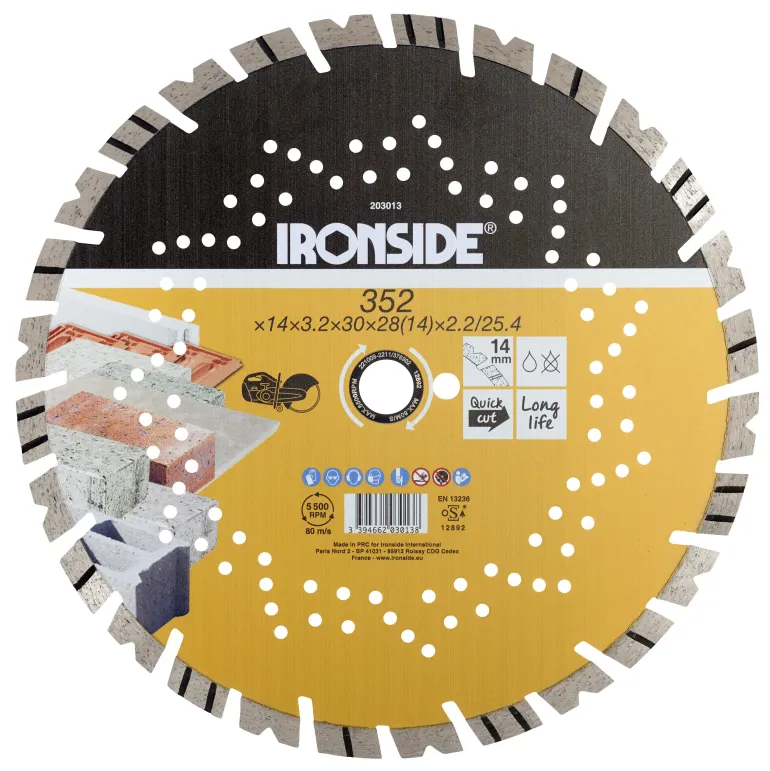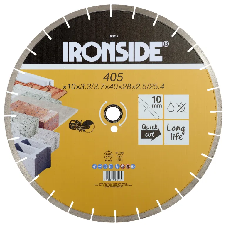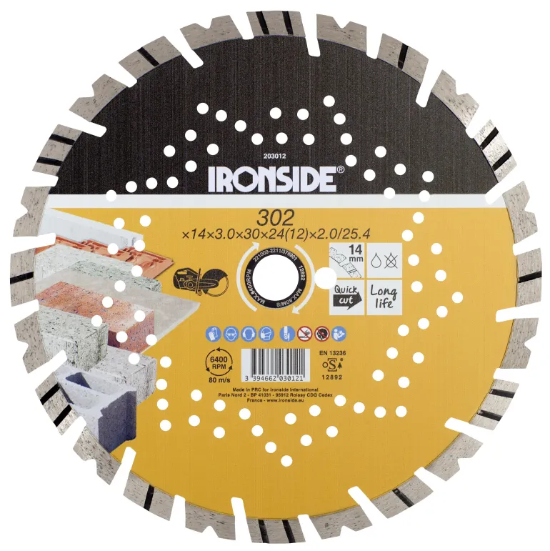 Ironside timanttikatkaisulaikka, joka soveltuu useille rakennusmateriaaleille. Sekä märkä- että kuivaleikkaukseen. Suositellaan betonille, tiilelle, kattotiilelle jne. Voidaan käyttää myös graniitille, luonnonkivelle, marmorille jne.