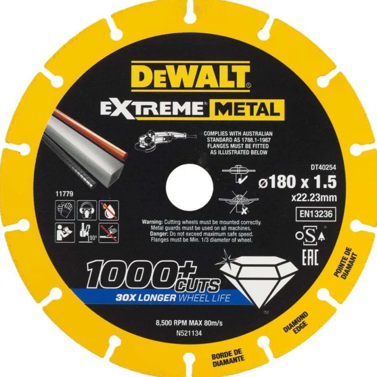 Dewalt Extreme Metal Diamond Edge -timanttikatkaisulaikan halkaisija on 230 mm ja keskireiän halkaisija 22,23 mm. Katkaisulaikan timanttireunasegmentit eivät kulu pois. Extreme Metal Diamond Edgen leikkaussyvyys pysyy samana viimeiseen leikkaukseen asti. Sopii monentyyppisille metalleille, kuten teräs, ruostumaton teräs, valurauta, raudoitusrauta, levymetalli, alumiini ja muut kuin rautametallit.