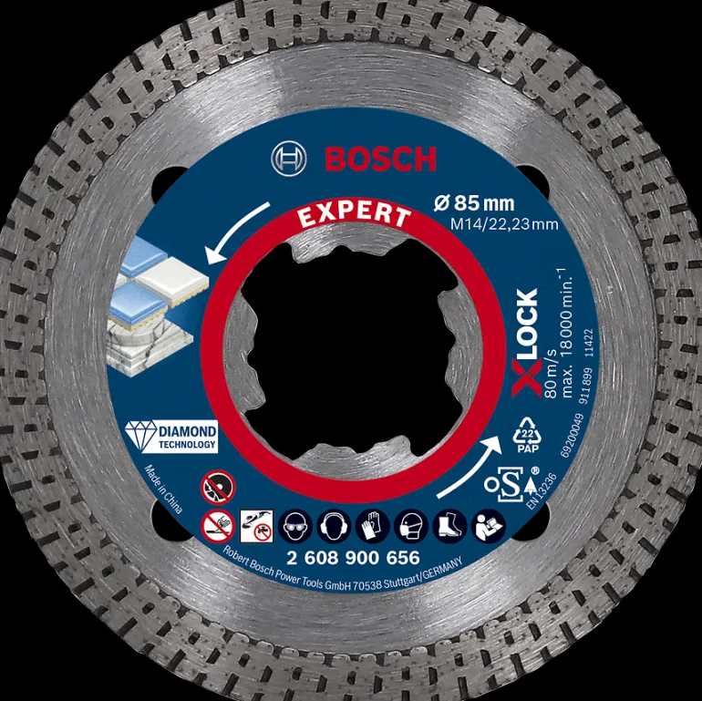 Bosch EXPERT HardCeramic X-LOCK-timanttikatkaisulaikka X-LOCK-pikakiinnityksellä (sopii myös ruuvikiinnitteisiin kulmahiomakoneisiin). Pienille kulmahiomakoneille 22,23 mm:n reikähalkaisijalla. Suunniteltu lujien laattojen tarkkaan leikkaamiseen. Soveltuu materiaaleille: kivilaatat ja kova kivi.