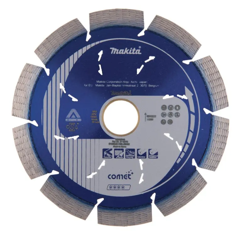 Makita Comet Rapide -timanttikatkaisulaikka, jonka halkaisija on 125 mm ja paksuus 2,2 mm. Reiän halkaisija on 22,23 mm. Laikassa on jäähdytysreiät tehokkaaseen jäähdytykseen raskaamman käytön aikana ja pitkää käyttöikää varten.
