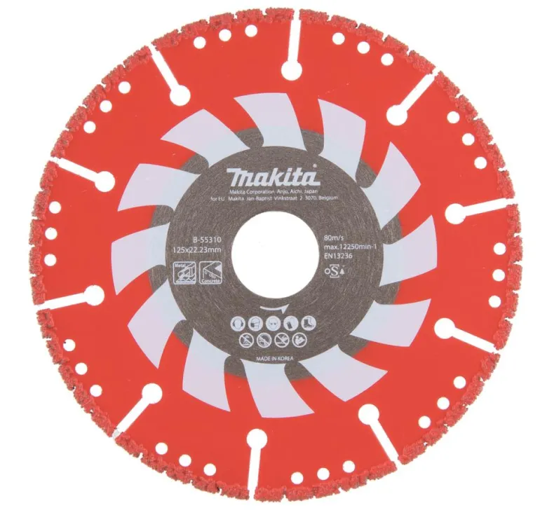 Makita Rescue-timanttikatkaisulaikka, jonka halkaisija on 125 mm ja paksuus 2,8 mm. Reiän halkaisija on 22,23 mm.