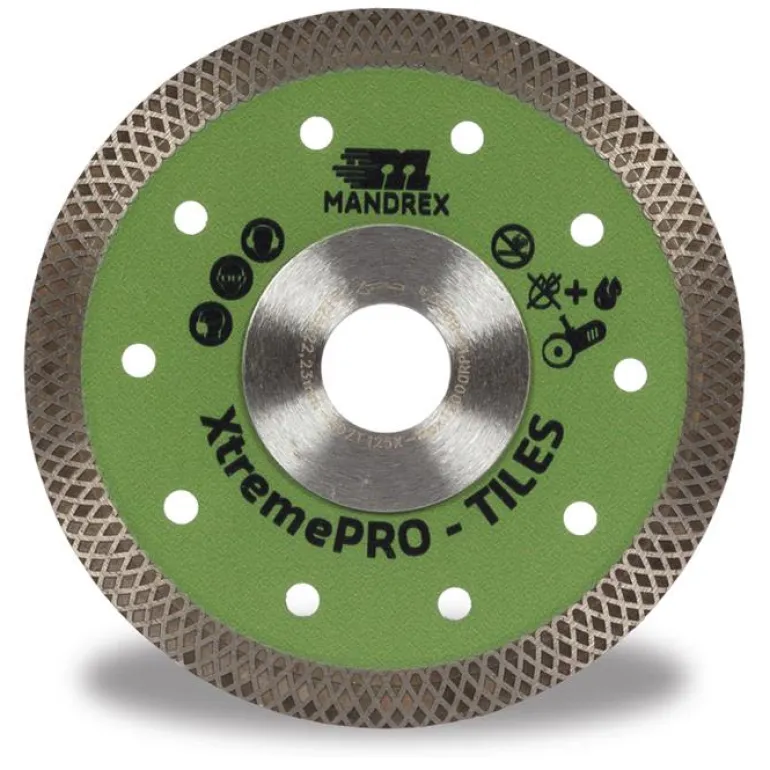 Erittäin ohuessa Mandrex Tiles XtremePRO timanttilaikassa on koko levyn ympäri jatkuva terä ja sen halkaisija on 125 mm. Kovan kaakelin sahaamiseen sopiva erityismuotoilu. Soveltuu käytettäväksi kiveen, laattoihin, marmoriin ja posliiniin.