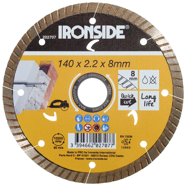 Timanttikatkaisulaikka, kuumapuristettu sintraus. Rakennus- ja rakennuskivimateriaaleille. Turbosegmentti vähentää lämpöä ja lisää pölynpoistoa. Nopeasti leikkaava ja soveltuva sekä kuiva- että märkäleikkaukseen.