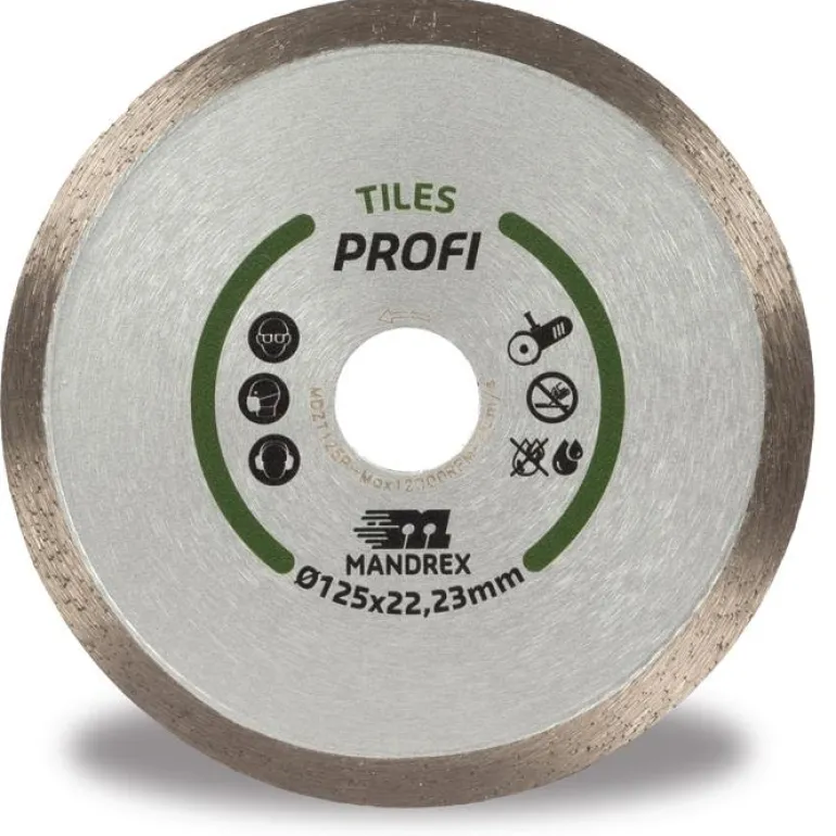 Mandrex Tiles Profi timanttilaikassa on koko levyn ympäri jatkuva terä ja sen halkaisija on 125 mm. Tiles Profi leikkaa nopeasti ja tehokkaasti ja sopii kaakelin ja posliinin leikkaamiseen.