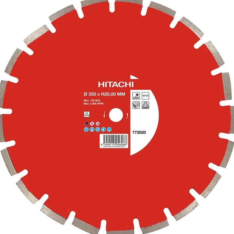 Laserhitsattu timanttilaikka 350 x 20 mm asfaltin ja asfalttipohjaisten materiaalien, pehmeiden materiaalien, kuten kalkkikiven, hiekkakiven, Porotonin ja kevytbetonin, leikkaamiseen. Sopii HiKOKI CM75EBP -katkaisukoneeseen.