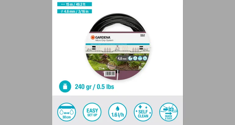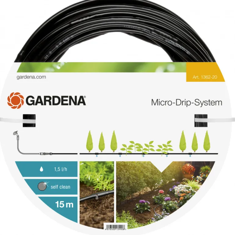 GARDENA Micro-Drip -järjestelmä on 15 metrin tippukasteluletku, jossa on tippusuuttimet 30 cm:n välein. Suuttimista kukin kastelee 1,5 l/h. Soveltuu pienten kukkapenkkien tai kasvimaiden sekä kasvirivien kasteluun. Innovatiivisen labyrinttiteknologian ansiosta tippusuuttimet ovat itsestään puhdistuvia.