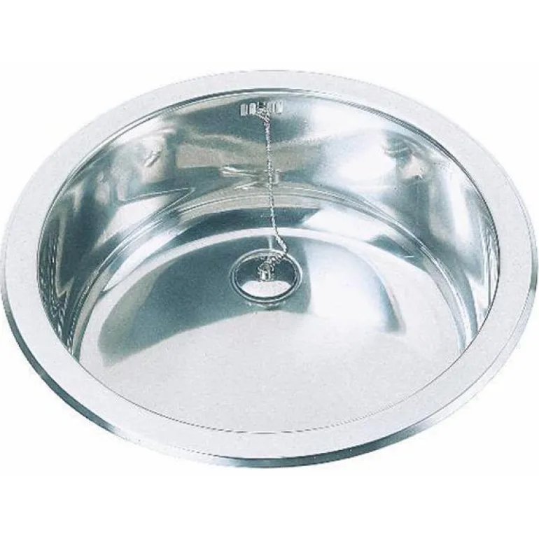Pyöreä ruostumattomasta teräksestä valmistettu tiskiallas, upotettavaa asennusta varten. Mukana tulppa, ketju, vesilukko ja ylivuotoaukko.