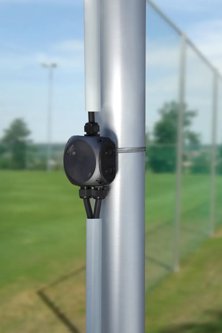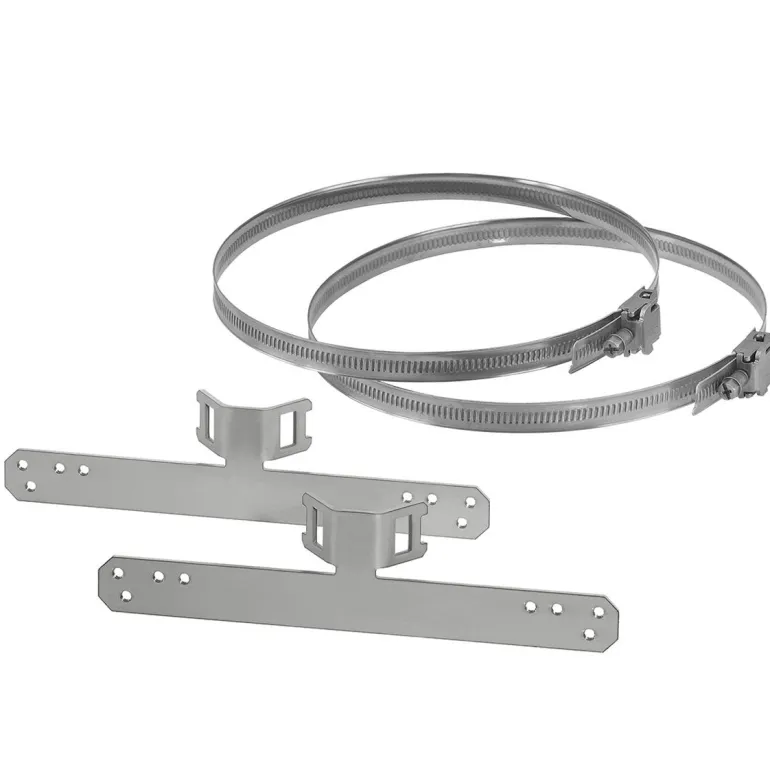 Kiinnike rasiaan asentamista varten sekä kiristimet halkaisijaltaan 60–150 mm:n tolpan ympärille asentamista varten. Mukana asennusruuvit.